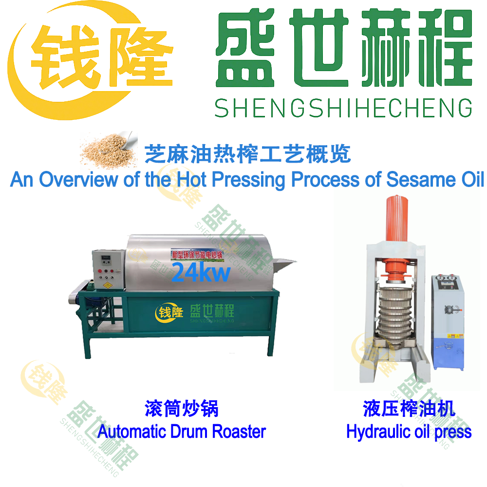- 芝麻油热榨工艺:滚筒炒锅炒制芝麻后直接入液压榨油机料桶压榨。采用此工艺压榨的芝麻油,香味浓郁,入口回甘,压榨出的油不用水化处理,下锅不起泡。